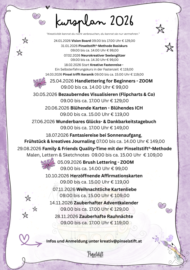 Hinweis: Wir haben uns bei der Anmeldung für Klick-to-Mail (Anmeldebutton bei den Kursen) entschieden. Sollte dieser bei dir nicht funktionieren, schreib uns bitte von deinem E-Mail Account deine Wunschanmeldung oder Anfrage an kreativ@pinselstift.at.